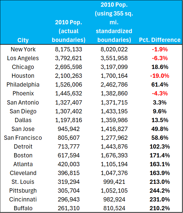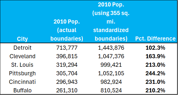 In each case the 355 square mile standard means double the population for all cities; four cities (St. Louis, Pittsburgh, Cincinnati and Buffalo) would have triple the population.